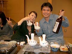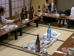 焼酎例会「園の露を味わう」開催報告 横浜焼酎委員会会員が訪れた「園の露」の蔵元、川崎醸造場さん。その時の写真をスライドショーで上映しながら園の露を味わう。そんな企画で今回の例会が開催された。 例会が終わって今回の「掬ぼれの集い」は、例会会場から徒歩7分、秋田比内地鶏を料理する「平戸庵桜木町店」。焼酎は大概の料理に合うけれどやきとりに焼酎というのは最高ですねぇ。それに今回は高木店長の計らいで鳥シャブと焼酎。焼酎は例会の6銘柄を加えて実に30銘柄。焼酎の試飲会にも匹敵する程の種類が用意された。もちろんあるだけ飲み放題。 |